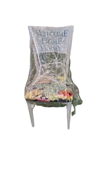 Silla blanca con respaldo calado y mensaje decorativo “WELCOME HOME FAMILY”. Incluye un asiento tapizado con estampado floral colorido. Ideal para aportar calidez a cocinas, comedores o zonas de reunión. Restaurada y embalada para su uso inmediato.