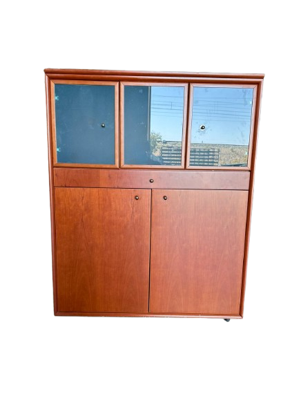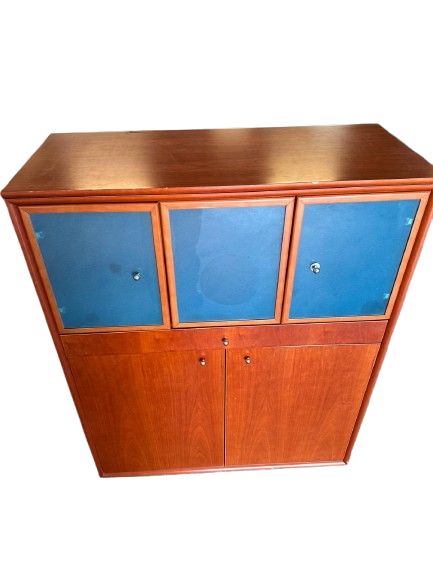 Este mueble combina la elegancia del diseño retro con una gran funcionalidad. La parte superior cuenta con tres vitrinas con puertas de cristal, ideales para exponer vajilla, libros o elementos decorativos. En la parte inferior, dos puertas que ofrecen espacio cerrado para almacenamiento adicional. Su acabado y sus líneas rectas recuerdan el estilo escandinavo de los años 60, aportando calidez y orden visual. Perfecto para comedores, despachos o salas de estar con gusto por lo vintage.