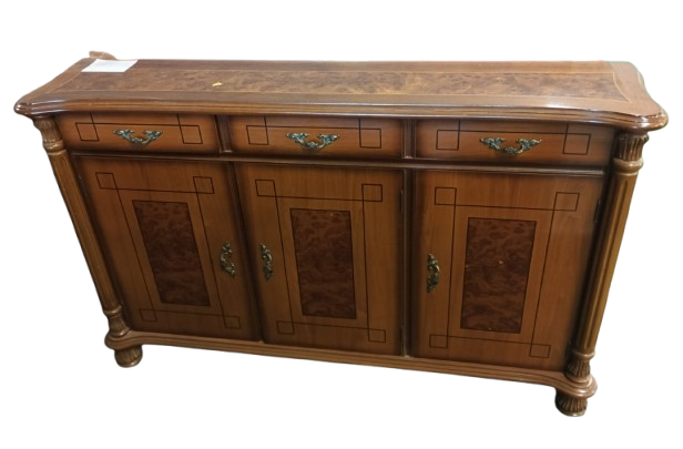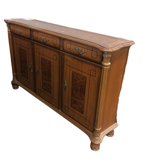 Este aparador combina diseño clásico y practicidad, con una estructura de madera maciza y un fino acabado barnizado. Su estética cuidada incluye columnas talladas, molduras curvas y paneles decorativos en relieve, lo que aporta un aire sofisticado al salón o comedor. Los tres amplios cajones superiores permiten organizar cubertería o pequeños objetos, mientras que las tres puertas inferiores ofrecen un espacio generoso para vajilla o textiles. Perfecto para ambientes tradicionales o rústicos que buscan elegancia y durabilidad.