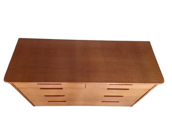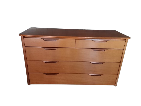 Cómoda clásica en tono miel, muy robusta y funcional. Cuenta con cinco amplios cajones que ofrecen gran capacidad de almacenaje. Ideal para dormitorio, salón o espacios de almacenaje.