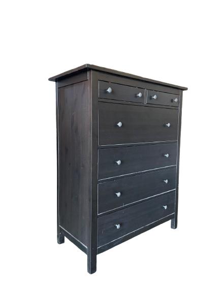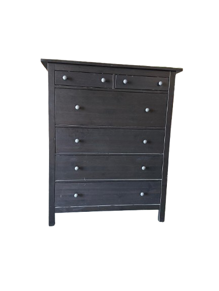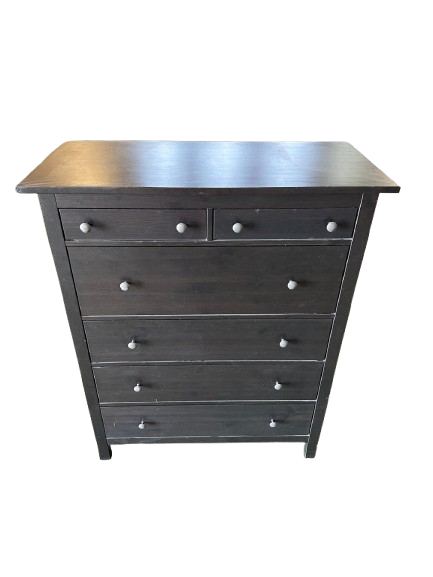 Mueble robusto con estructura de madera maciza y acabado oscuro. Incluye seis cajones con tiradores metálicos en color plata y superficie superior ancha para colocar lámparas o elementos decorativos. Perfecta para dormitorios modernos o clásicos.