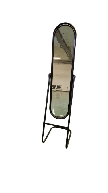 Espejo de pie con estructura metálica negra de líneas sencillas. Su forma alargada permite una visión completa del cuerpo. Ideal para dormitorios, vestidores o comercios. Aporta estilo sin ocupar demasiado espacio.