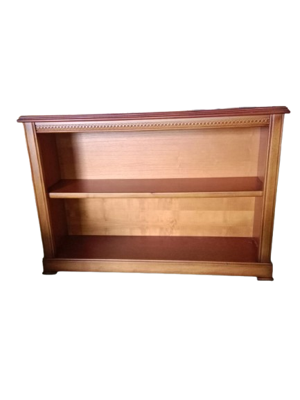 Estantería baja de madera con diseño clásico y elegante. Cuenta con dos niveles amplios para colocar libros, decoración o almacenamiento. Ideal para salones, despachos o recibidores.