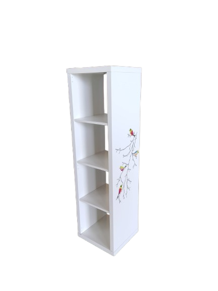 Estantería blanca estrecha con cuatro baldas. Incluye un bonito diseño lateral con ramas y pajaritos. Ideal para dormitorios infantiles o espacios decorativos.