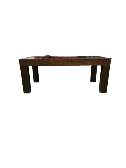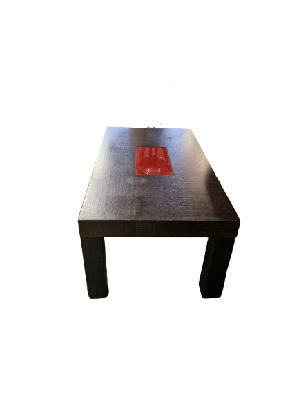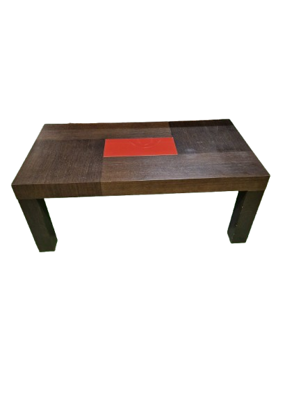 Mesa de centro de madera en tono oscuro con diseño robusto y líneas rectas. Incorpora un detalle central en color rojo que aporta un toque distintivo. Estructura estable y resistente para uso diario. Ideal para salones o zonas de estar. Fácil de integrar en diferentes estilos decorativos. Funcional y decorativa a la vez.