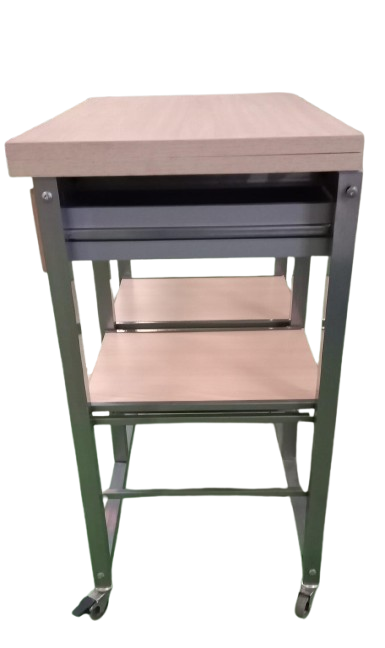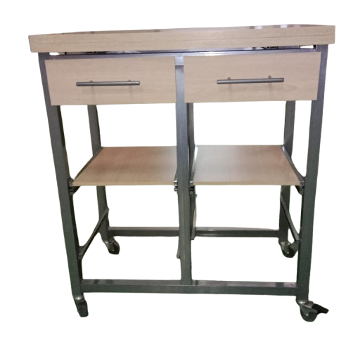 Mesa auxiliar plegable con ruedas, estructura metálica y superficie de madera. Cuenta con dos cajones y estantes inferiores, ideal como carrito de cocina o apoyo. Práctica, resistente y fácil de mover.