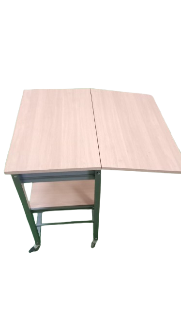 Mesa auxiliar de segunda mano con diseño funcional y versátil, fabricada con estructura metálica robusta y tablero en acabado madera clara. Dispone de dos cajones superiores con tiradores metálicos y dos estantes inferiores que ofrecen espacio adicional de almacenaje. Incorpora ruedas para facilitar su movilidad y sistema plegable que permite ampliar o adaptar su uso según necesidades. Este tipo de muebles auxiliares es muy utilizado como carrito de cocina, mesa de apoyo o mueble organizador, gracias a su practicidad y resistencia . Ideal tanto para uso doméstico como profesional (taller, almacén, oficina o hostelería). Se encuentra en buen estado general, con signos normales de uso.