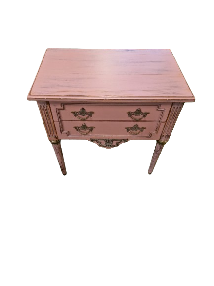 Mesita restaurada con acabado rosa decapado estilo vintage. Incluye cajones con tiradores metálicos clásicos. El acabado envejecido aporta personalidad y encanto. Ideal como mesilla o mueble decorativo.