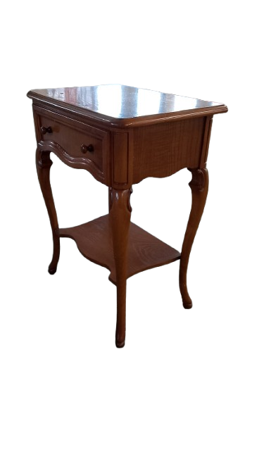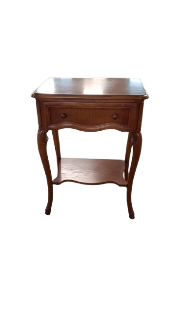 Mesita auxiliar de estilo clásico en madera, con cajón frontal y balda inferior. Perfecta como mesita de noche o apoyo en salón. Diseño ligero y elegante.
