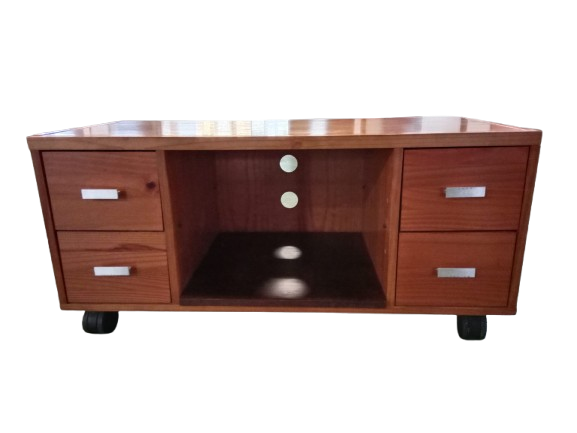 Mueble para TV con estructura en madera y cuatro cajones laterales. Hueco central para aparatos electrónicos. Orificios traseros para cables. Equipado con ruedas para facilitar el desplazamiento. Diseño funcional y resistente. Ideal para salones o dormitorios.