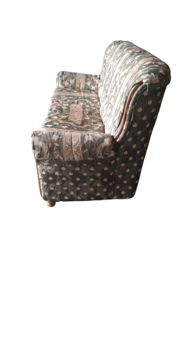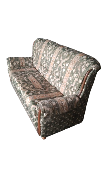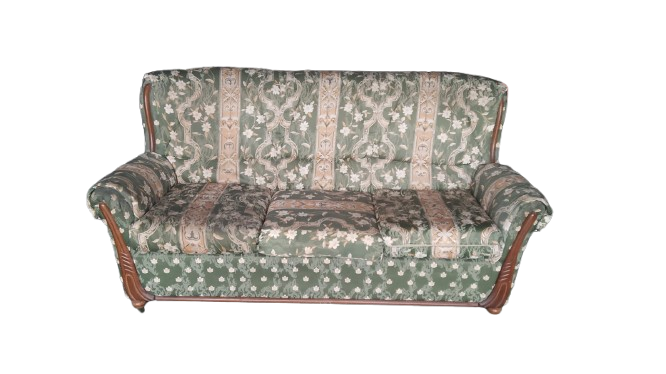 Sofá de tres plazas con estructura robusta y cojines acolchados. Tapizado con estampado clásico en tonos verdes. Reposabrazos amplios y confortables. Ideal para salones de estilo tradicional. Asientos espaciosos para toda la familia. Mueble cómodo y duradero.
